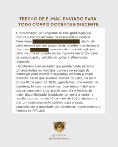 No segundo semestre, voltei a ser alvo de uma nova onda de ataques e “cancelamentos”, inclusive com ameaças. Diante desse cenário, o programa publicou, em seu perfil oficial no Instagram (@PPCulTUFF), um comunicado no qual se desvinculou publicamente do meu trabalho acadêmico e voltou a me imputar, agora de forma pública, a prática de crimes. Esse comunicado também foi afixado na porta da sala de aula e ao lado da lousa, com evidente caráter intimidatório.