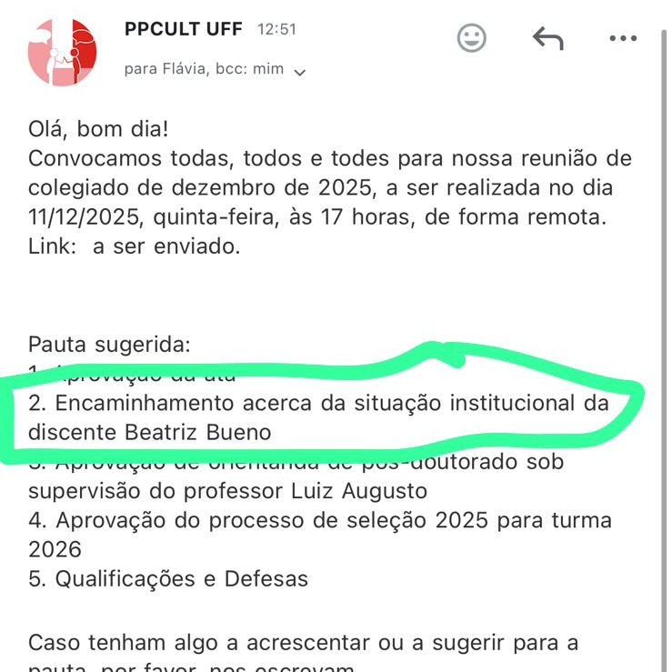Na mesma semana, fui convocada por e-mail para uma reunião de colegiado, sem qualquer informação prévia sobre o conteúdo da pauta, que constava apenas como “situação institucional da discente Beatriz Bueno”. Fui exposta perante todo o colegiado sem conhecer o tema da reunião e sem a oportunidade de redigir ou apresentar uma defesa formal. Nessa reunião, minha expulsão foi deliberada por unanimidade, sob aplausos dos presentes.